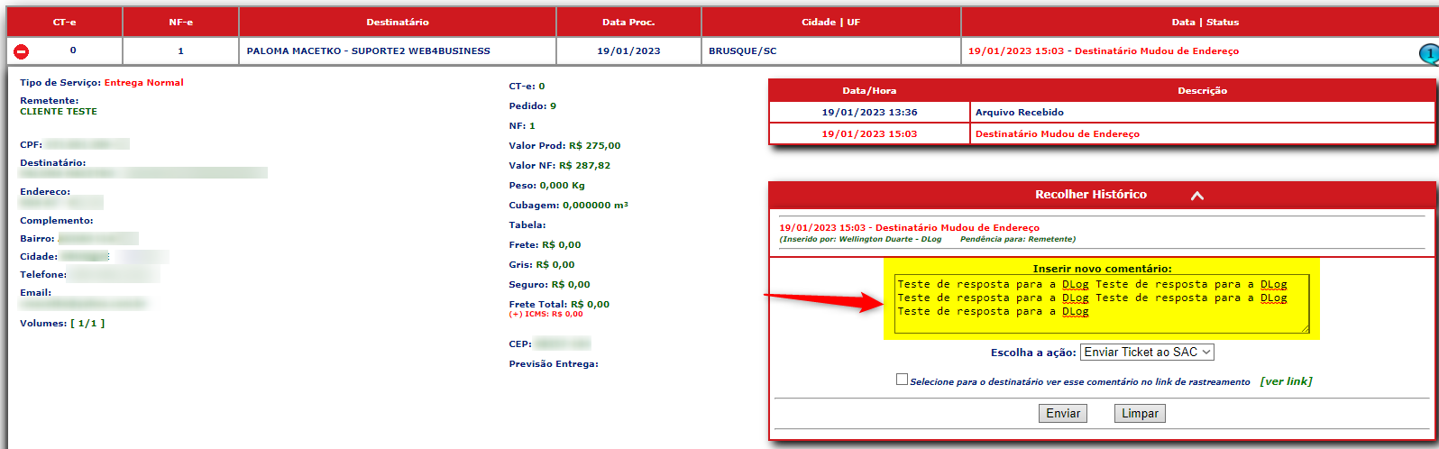 No campo "**Inserir novo comentário**", preencha uma resolução para o problema indicado pela DLog: