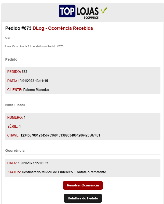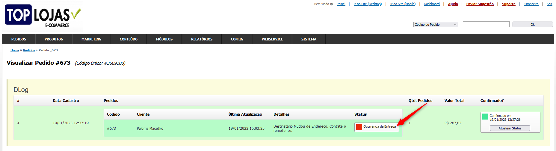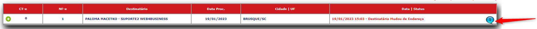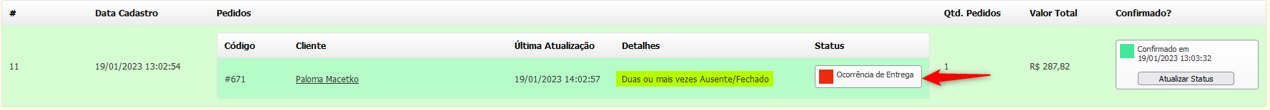 Em caso de algum **Problema na Entrega**, a coluna "**Status**" ira mudar para "**Ocorrência de Entrega**":