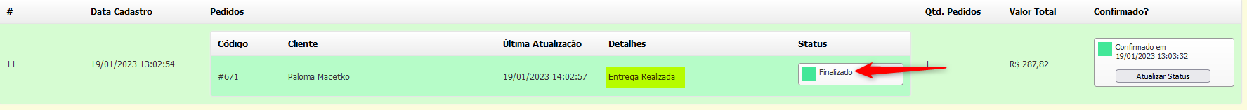 Quando o pedido for **Entregue**, a coluna "**Status**" ira mudar para "**Finalizado**":