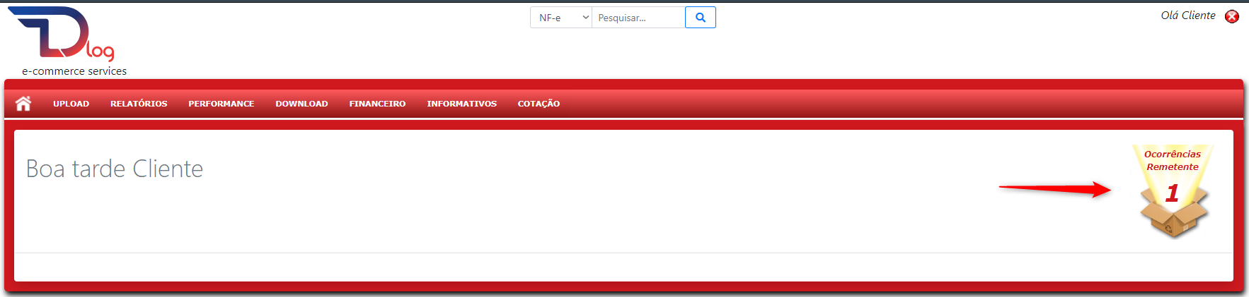 Dentro do painel da DLog observe que será exibido um aviso de "**Ocorrências Pendentes**":