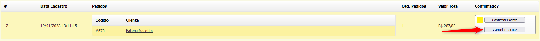 Caso você ainda ***não tenha confirmado*** um Pacote você pode **Cancelar** ele, para isto, clique em "**Cancelar**" no Pacote desejado: