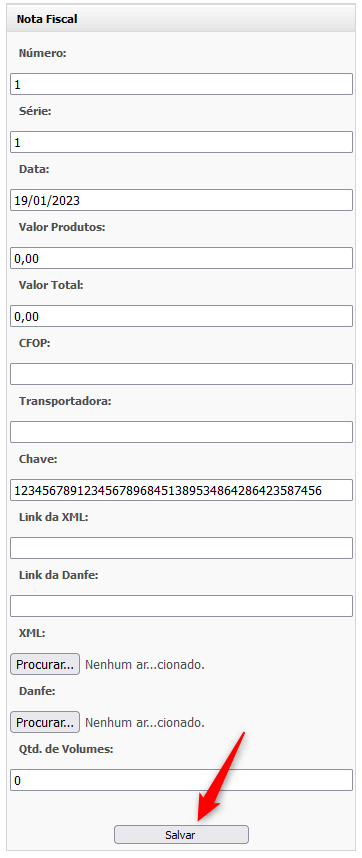Após ter sido preenchido os dados da Nota Fiscal, clique em "**Salvar**":