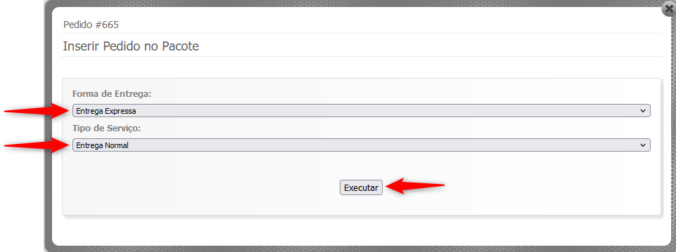 Será exibido uma janela onde permite que você altere a "**Forma de Entrega"** que será utilizada e altere "**Tipo de Serviço"**, nesta janela, clique em "**Executar**":&#x20;