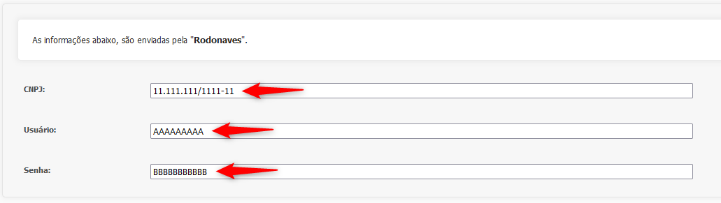Após a conta ser criada, solicite a Rodonaves o "**Usuário**" e a "**Senha**" de integração.