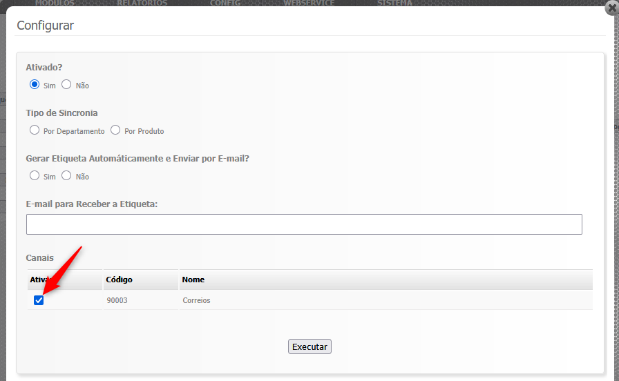 Nesta janela, marque todos os "**Canais**" que você ira utilizar (*Normalmente apenas os Correios*):&#x20;